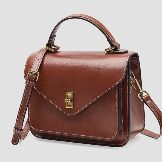 Structured lines and refined detailing define this boxy top-handle bag crafted from genuine leather. Designed with a firm silhouette that holds its shape, it features an angular flap with contrast stitching for a clean, modern finish. The lock-buckle closure adds a polished touch, while the spacious interior with a divider pocket keeps essentials neatly organised. With both top handles and an adjustable long strap included, it moves easily from hand-carry to crossbody—suited for workdays, city outings, and composed everyday wear.