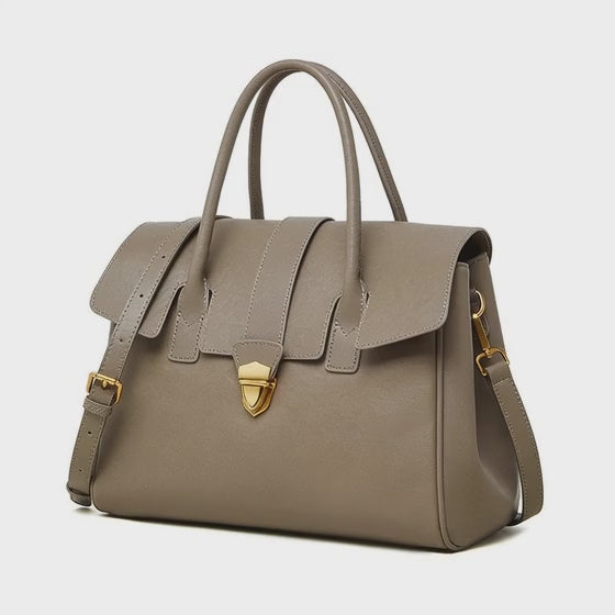 Structured, polished, and built for everyday versatility, this refined handbag balances classic form with modern function. Crafted from premium faux leather with a softly pebbled finish, it features a clean silhouette accented by a gold-tone buckle for a timeless touch. Designed with sturdy top handles and an adjustable crossbody strap, it moves easily from workdays to evenings out, while the roomy interior fits daily essentials without compromising its composed shape.