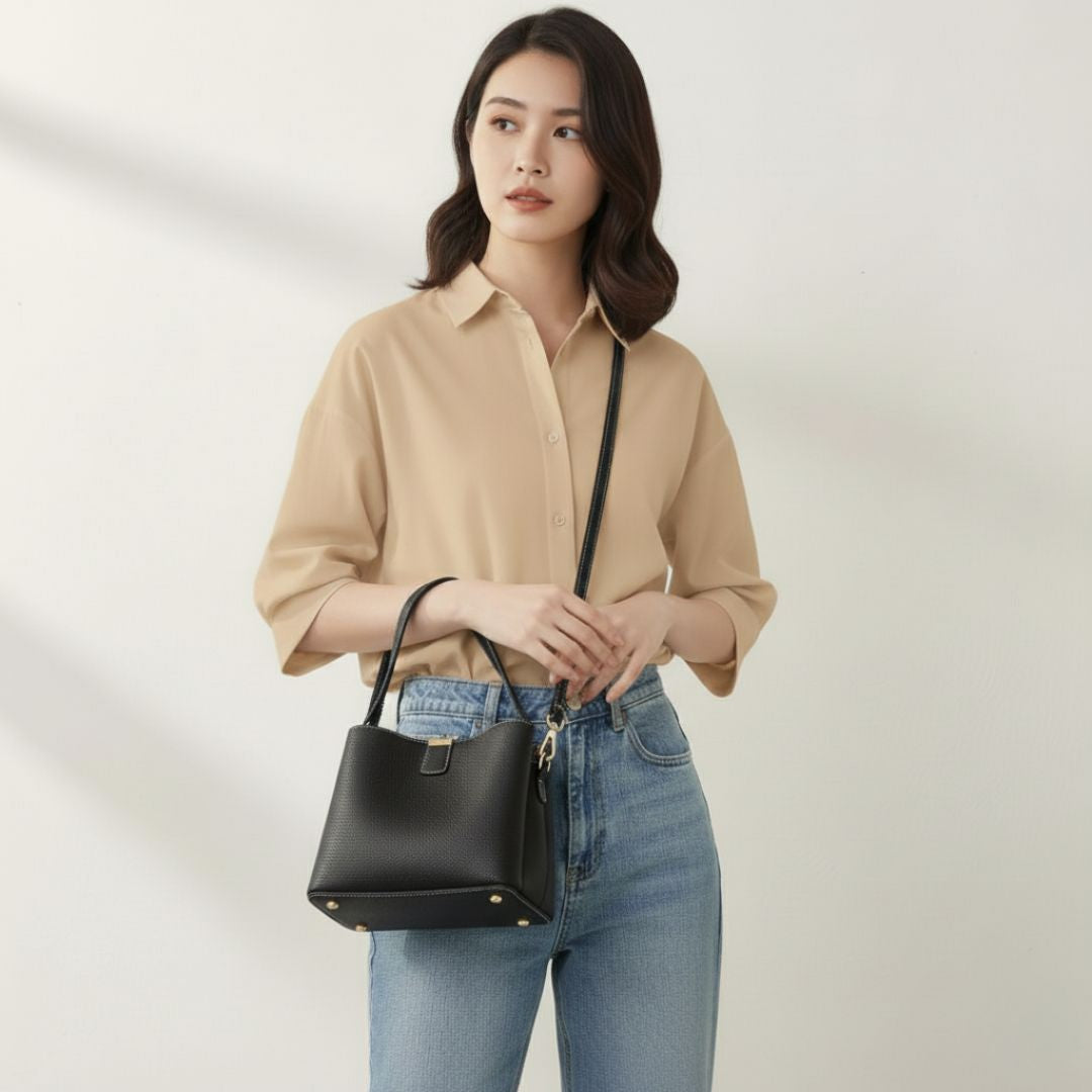 A structured bucket bag designed for everyday flexibility with a polished finish. Crafted from genuine cowhide leather with a subtly textured surface, it holds its shape while remaining comfortable to carry. The magnetic closure with a zippered pouch insert keeps essentials secure and organised, while multiple carry options—top handle, shoulder strap, or adjustable crossbody—make it easy to move from workdays to weekends without changing bags.